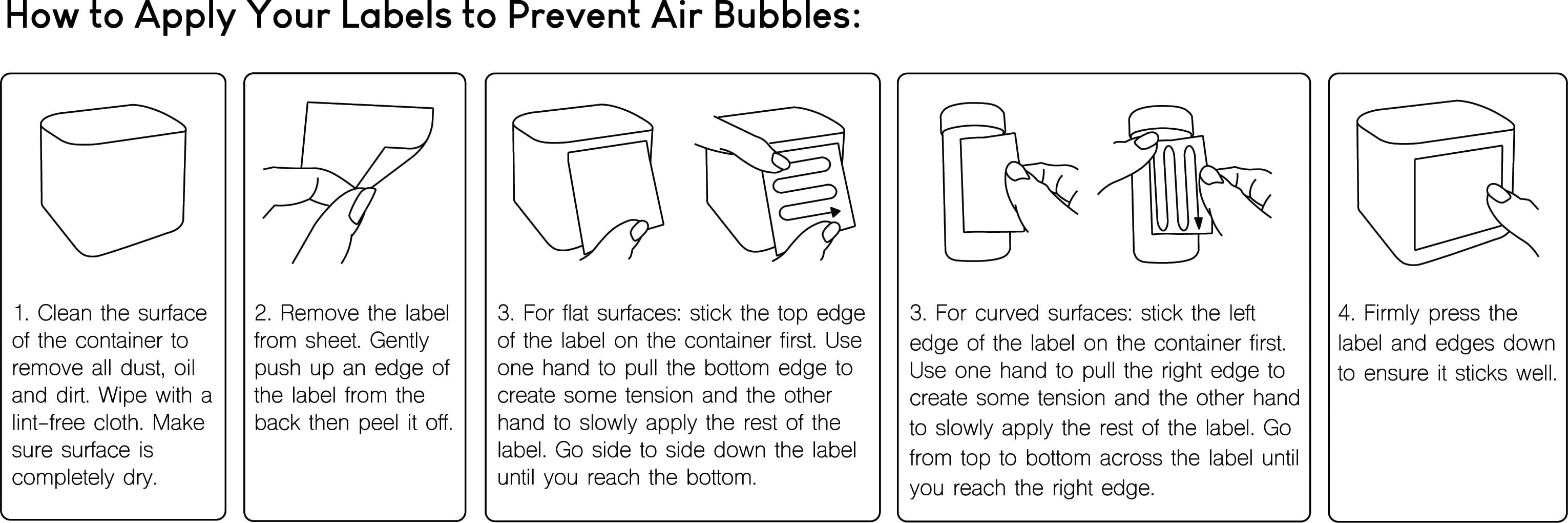 Watch the videos below to see how you can apply your new pantry and spice labels without air bubbles. Always clean your container and ensure it is free of dirts and debris before applying the labels.